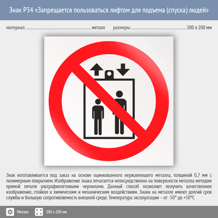 Знак P34 «Запрещается пользоваться лифтом для подъема (спуска) людей» (металл, 200х200 мм) в Кызыле купить