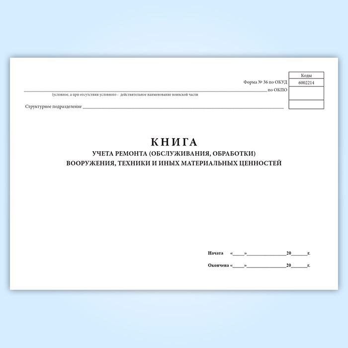Книга учета ремонта (обслуживания, обработки) вооружения, техники и иных материальных ценностей (форма 36) в Кызыле купить