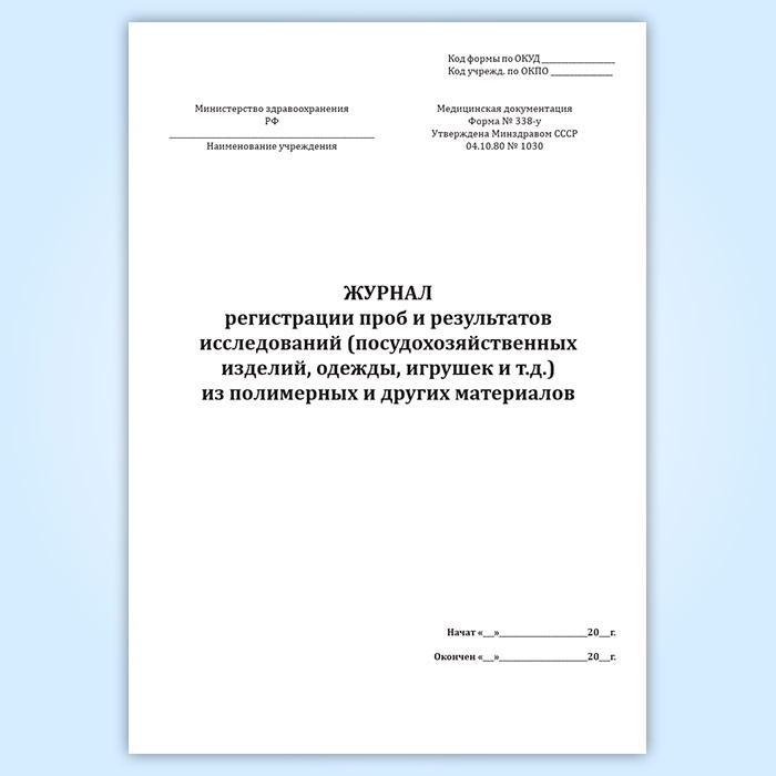 Журнал регистрации проб и результатов исследований (посудохозяйственных изделий, одежды, игрушек и т.д.) из полимерных и других материалов (форма № 338-у) в Кызыле купить