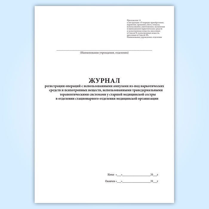 Журнал регистрации операций с использованными ампулами из-под наркотических средств и психотропных веществ, использованными трансдермальными терапевтическими системами у старшей медицинской сестры в отделении стационарного отделения медицинской организации в Кызыле купить