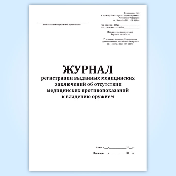 Журнал регистрации выданных медицинских заключений об отсутствии медицинских противопоказаний к владению оружием (форма 002-О/У-10) в Кызыле купить