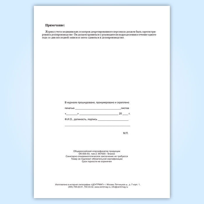 Журнал учета медицинских осмотров декретированного персонала в Кызыле купить