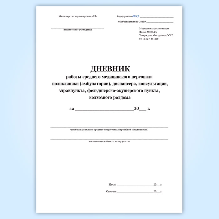 Дневник работы среднего медицинского персонала поликлиники (амбулатории), диспансера, консультации, здравпункта, фельдшерско-акушерского пункта, колхозного роддома (форма 039-1/у) в Кызыле купить