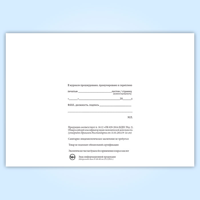Вы получаете печатную продукцию прошнурованной и c местом для вашей печати в соответствии с действующими нормативными документами: