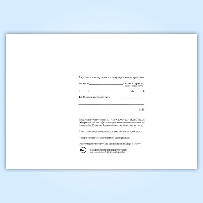 Вы получаете печатную продукцию прошнурованной и c местом для вашей печати в соответствии с действующими нормативными документами: