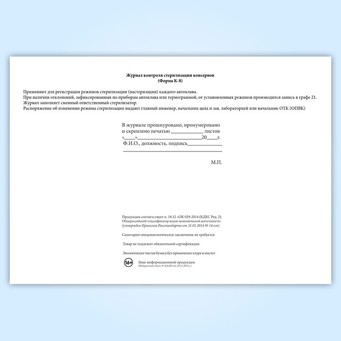 Журнал контроля стерилизации консервов (форма К-8) в Кызыле купить
