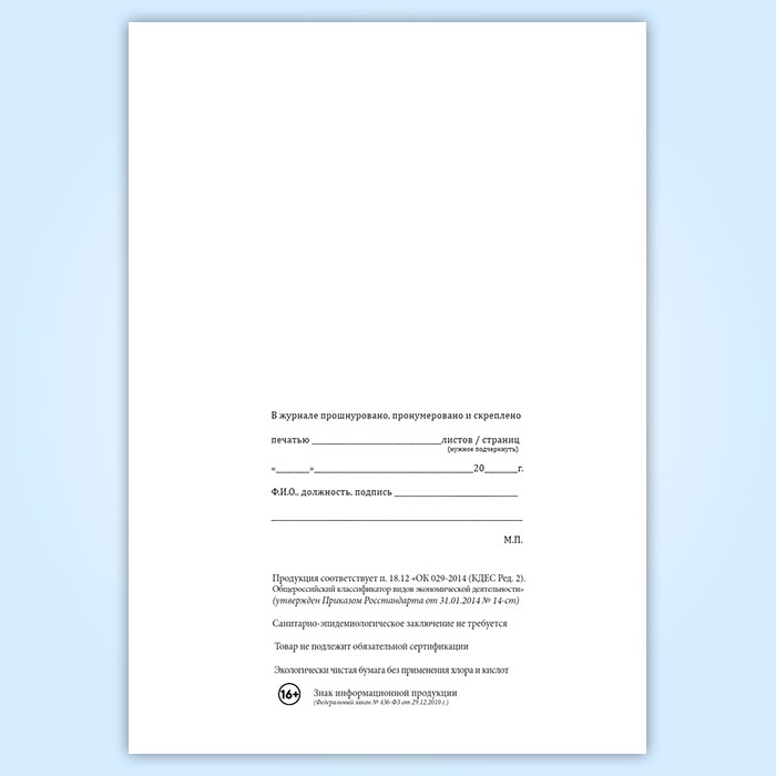 Вы получаете печатную продукцию прошнурованной и c местом для вашей печати в соответствии с действующими нормативными документами: