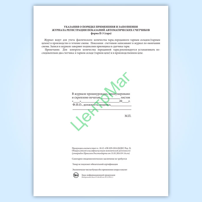 Журнал регистрации показаний автоматических счетчиков (форма № П-3 тара) в Кызыле купить