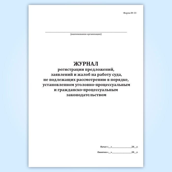Журнал регистрации предложений, заявлений и жалоб на работу суда, не подлежащих рассмотрению в порядке, установленном уголовно-процессуальным и гражданско-процессуальным законодательством (форма № 23) в Кызыле купить