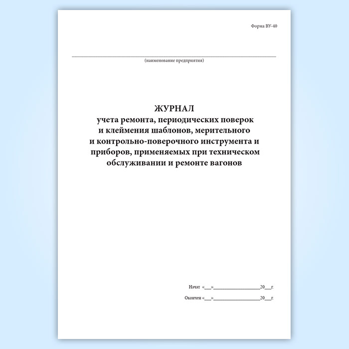 Журнал учета ремонта, периодических поверок и клеймения шаблонов, мерительного и контрольно-поверочного инструмента и приборов, применяемых при техническом обслуживании и ремонте вагонов (форма ВУ-40) в Кызыле купить