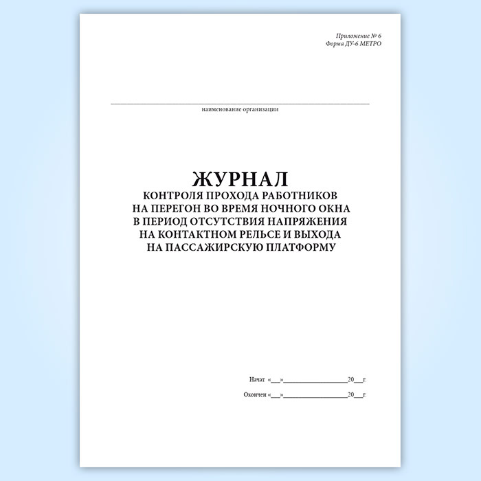 Журнал контроля прохода работников на перегон во время ночного окна в период отсутствия напряжения на контактном рельсе и выхода на пассажирскую платформу (форма ДУ-6 МЕТРО) в Кызыле купить