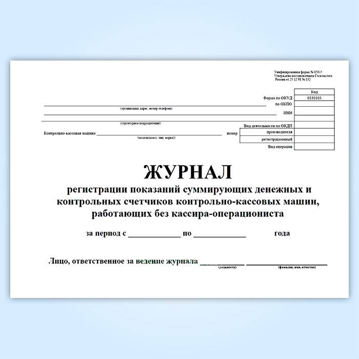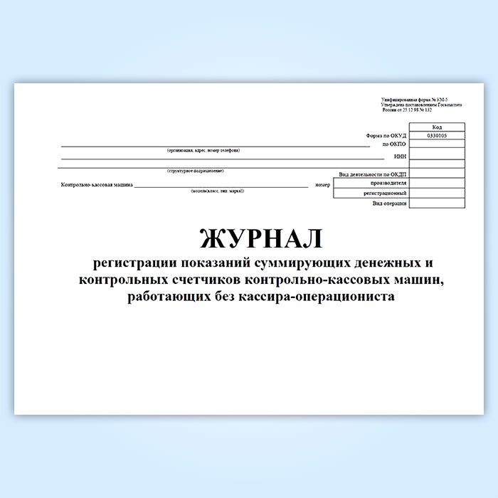Журнал регистрации показаний суммирующих денежных и контрольных счетчиков контрольно-кассовых машин, работающих без кассира-операциониста (форма КМ-5) в Кызыле купить