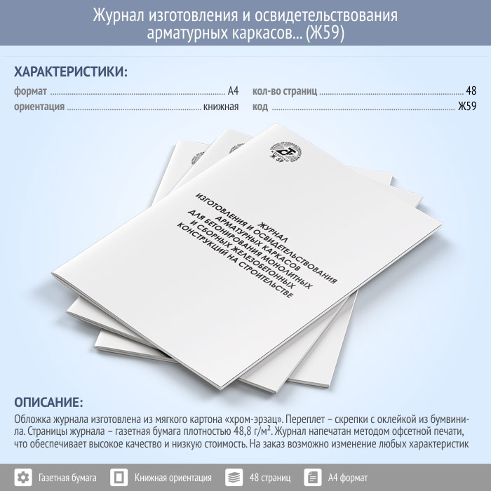 Журнал изготовления и освидетельствования арматурных каркасов для бетонирования монолитных и сборных железобетонных конструкций на строительстве (Ф-48) (48 стр., Ж59) в Кызыле купить