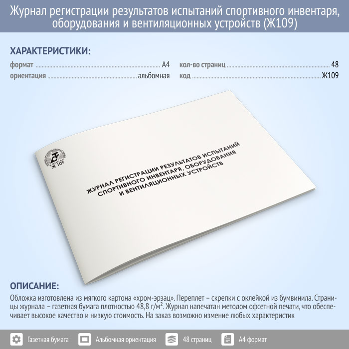 Журнал регистрации результатов испытаний спортивного инвентаря, оборудования и вентиляционных устройств (48 стр., Ж109) в Кызыле купить