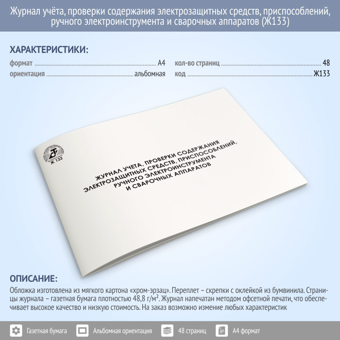 Журнал учета проверки и содержания электрозащитных средств, приспособлений, ручного электроинструмента и сварочных аппаратов (48 стр., Ж133) в Кызыле купить