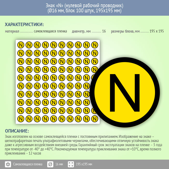 Знак (плакат) «N» (нулевой рабочий проводник), S47 (пленка, диаметр 16 мм, блок 100 штук, 195х195 мм)