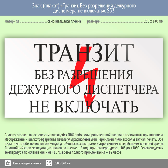 <Знак «Транзит без разрешения дежурного диспетчера не включать» может быть изготовлен любого размера на самоклеящейся пленке, пластике толщиной 0.5, 2 или 4 мм и металле. Также возможно применение фотолюминесцентных и световозвращающих материалов