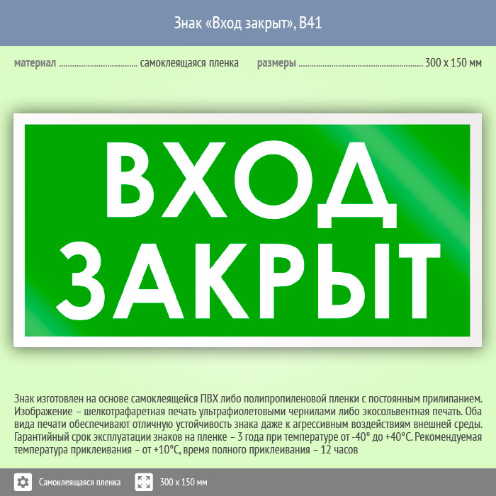 Знак «Вход закрыт» может быть изготовлен любого размера на самоклеящейся пленке, пластике толщиной 0.5, 2 или 4 мм и металле. Также возможно применение фотолюминесцентных и световозвращающих материалов