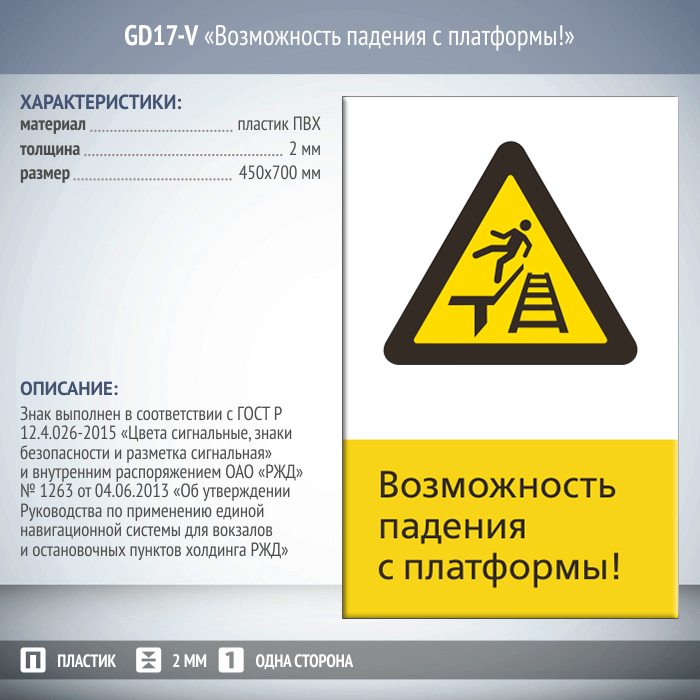 Знак безопасности «Возможность падения с платформы!» выполняется в одностороннем (металл и пластик) и двустороннем (только металл) виде, на ПВХ-пластике, толщиной 2 мм или листе оцинкованного металла, толщиной 0,8 мм. Размеры знаков - 450 мм х 700 мм (вертикальная ориентация) либо 540 мм х 220 мм (горизонтальная ориентация). Знаки изготавливаются в полном соответствии с ГОСТ Р 12.4.026-2015 «Цвета сигнальные, знаки безопасности и разметка сигнальная» и внутренним распоряжением ОАО «РЖД» № 1263 от 04.06.2013 «Об утверждении Руководства по применению единой навигационной системы для вокзалов и остановочных пунктов холдинга РЖД». По желанию заказчика возможно использование светоотражающих материалов. Так же при необходимости производим закругление углов знака