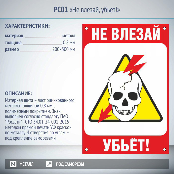 Знак «Не влезай, убьет!», РС01 (металл, 200х300 мм, отверстия под саморезы) в Кызыле купить