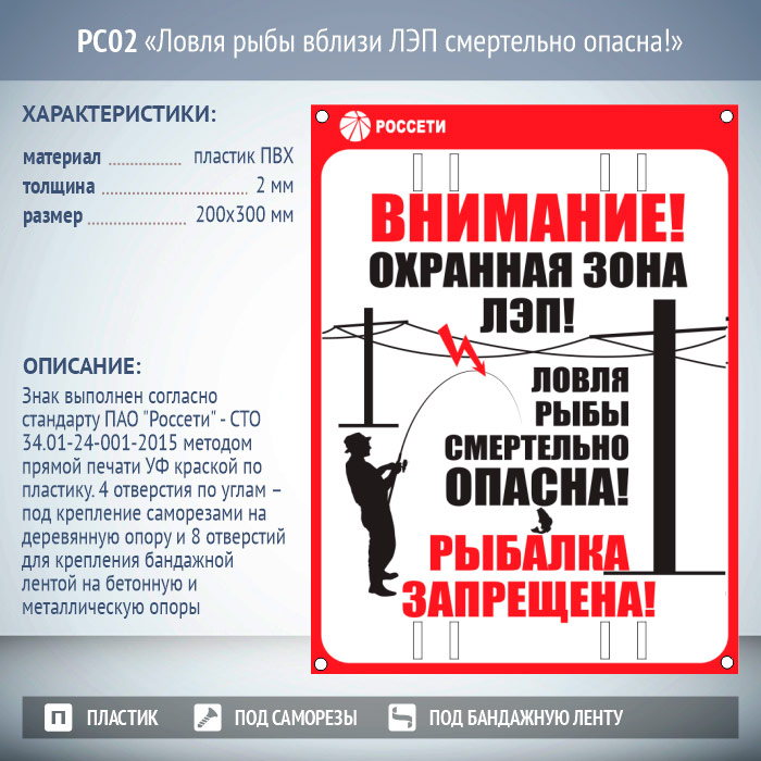 Знак «Ловля рыбы вблизи ЛЭП смертельно опасна!», РС02 (пластик 2 мм, 200х300 мм, отверстия под бандажную ленту) в Кызыле купить