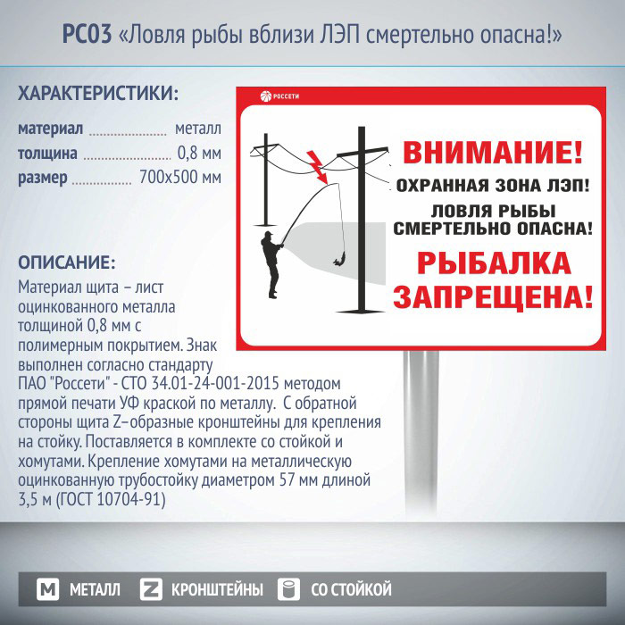 Информационный щит «Ловля рыбы вблизи ЛЭП смертельно опасна!», РС03 (металл, 700х500 мм, с металлической стойкой) в Кызыле купить