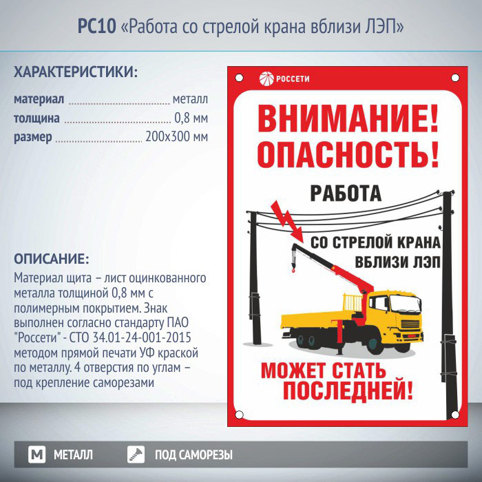 Знак «Работа со стрелой крана вблизи ЛЭП», РС10 (металл, 200х300 мм, отверстия под саморезы) в Кызыле купить