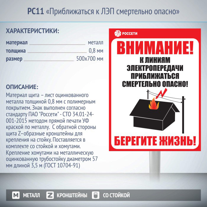 Информационный щит «Приближаться к ЛЭП смертельно опасно», РС11 (металл, 500х700 мм, с металлической стойкой) в Кызыле купить
