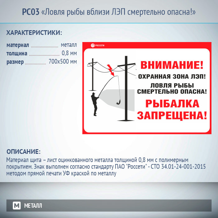 Информационный щит «Ловля рыбы вблизи ЛЭП смертельно опасна!», РС03 (металл, 700х500 мм) в Кызыле купить