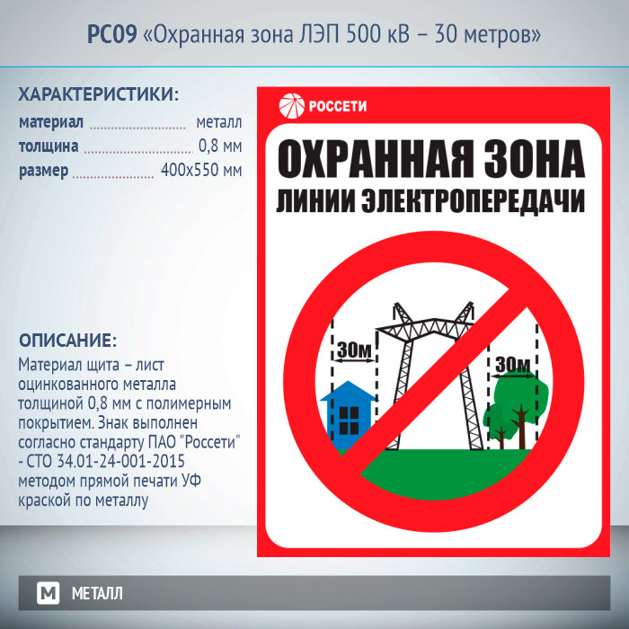 Знак «Охранная зона ЛЭП 500 кВ – 30 метров», РС09 (металл, 400х550 мм) в Кызыле купить