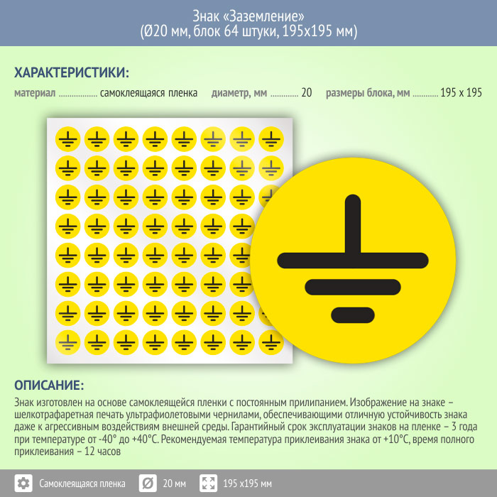 Знак (плакат) «Заземление», S46 (пленка, диаметр 20 мм, блок 64 штуки, 195х195 мм) в Кызыле купить