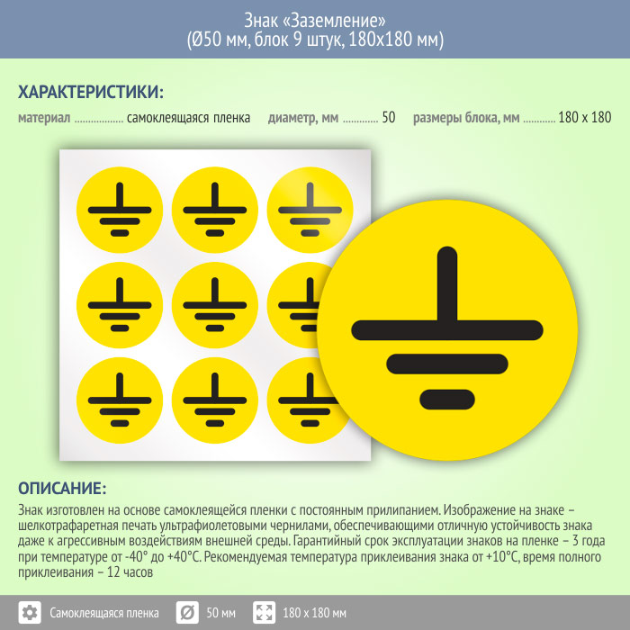 Знак (плакат) «Заземление», S46 (пленка, диаметр 50 мм, блок 9 штук, 180х180 мм) в Кызыле купить
