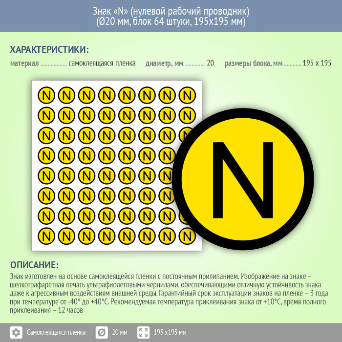 Знак (плакат) «N» (нулевой рабочий проводник), S47 (пленка, диаметр 20 мм, блок 64 штуки, 195х195 мм) в Кызыле купить