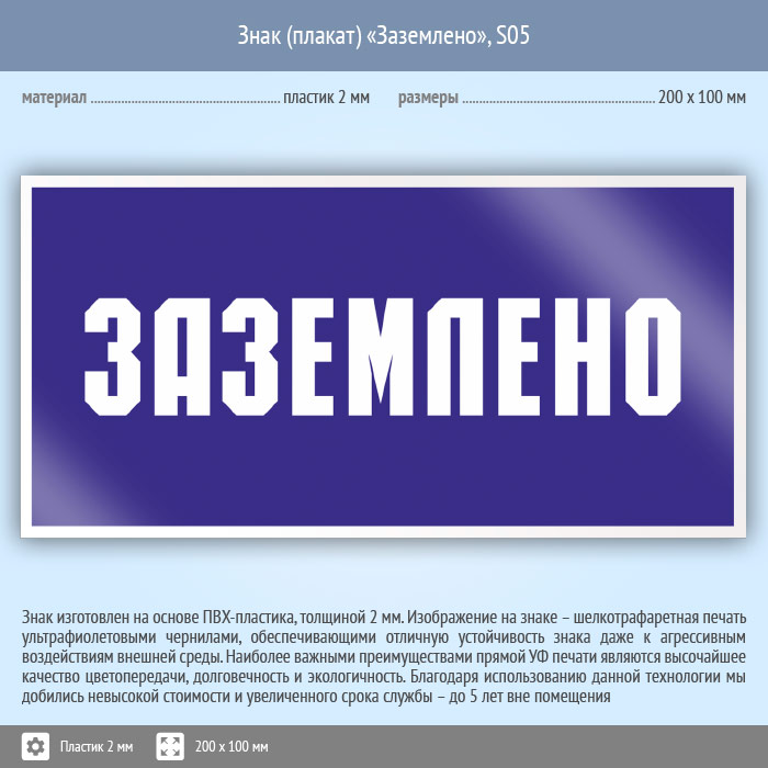 Знак (плакат) «Заземлено», S05 (пластик, 200х100 мм) в Кызыле купить