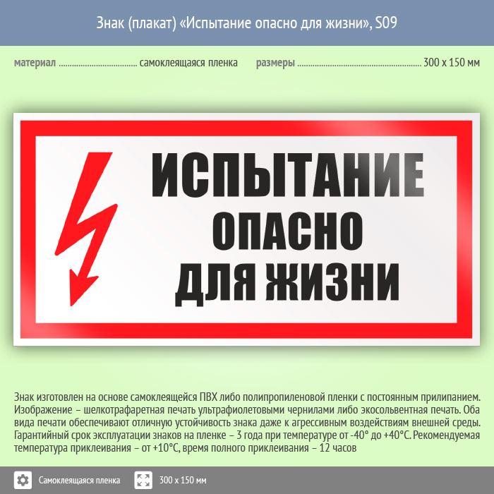 Знак (плакат) «Испытание опасно для жизни», S09 (пленка, 300х150 мм) в Кызыле купить