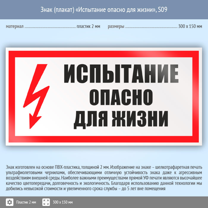Знак (плакат) «Испытание опасно для жизни», S09 (пластик, 300х150 мм) в Кызыле купить