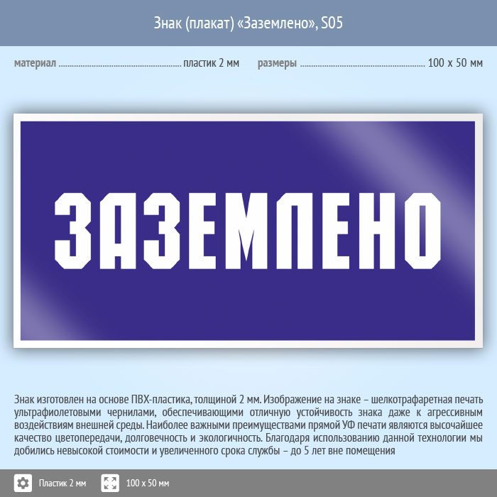 Знак (плакат) «Заземлено», S05 (пластик, 100х50 мм) в Кызыле купить