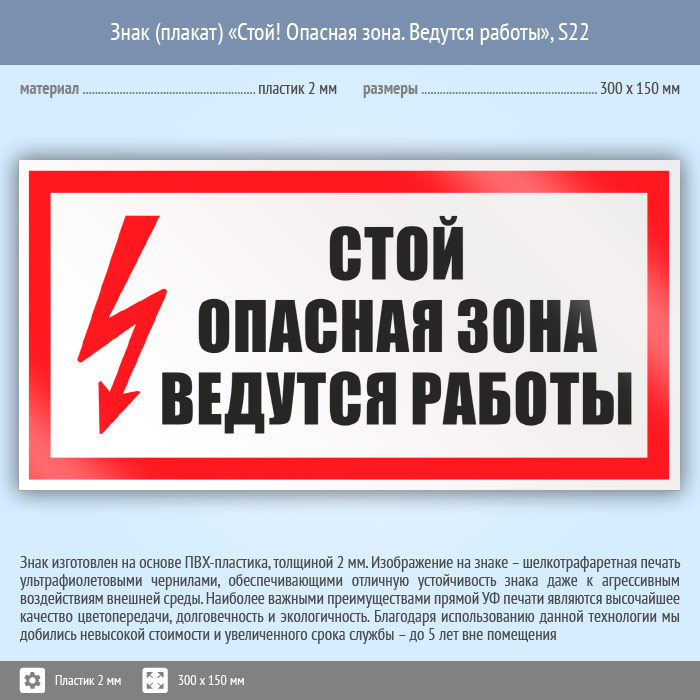 Знак (плакат) «Стой! Опасная зона. Ведутся работы», S22 (пластик, 300х150 мм) в Кызыле купить