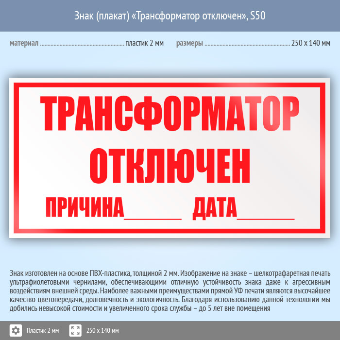 Знак (плакат) «Трансформатор отключен», S50 (пластик, 250х140 мм) в Кызыле купить