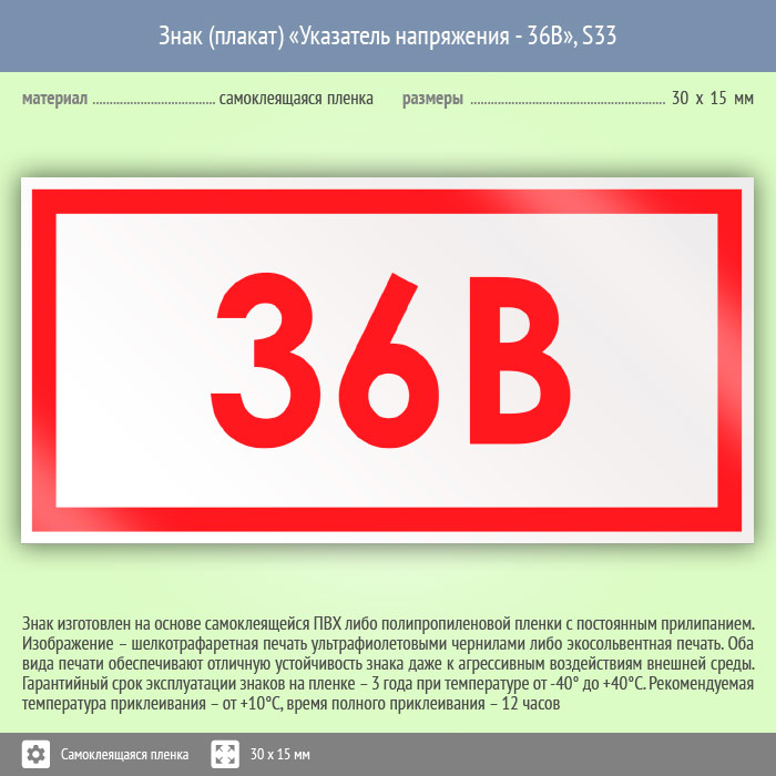 Знак (плакат) «Указатель напряжения - 36В», S33 (50 штук, пленка, 30х15 мм) в Кызыле купить