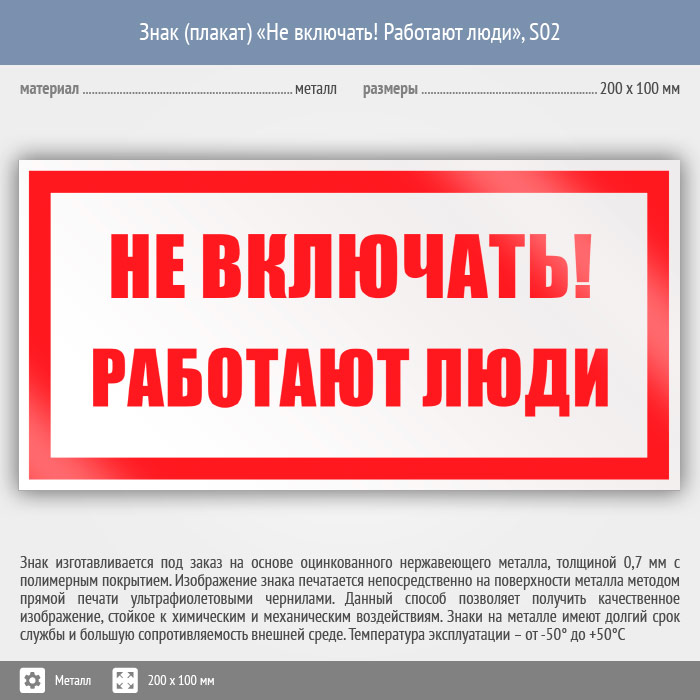 Знак (плакат) «Не включать! Работают люди», S02 (металл, 200х100 мм) в Кызыле купить