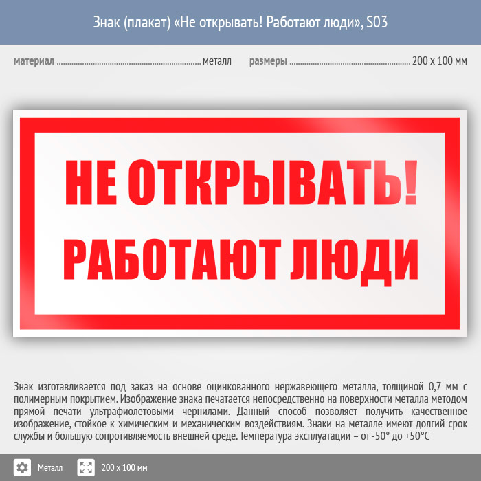 Знак (плакат) «Не открывать! Работают люди», S03 (металл, 200х100 мм) в Кызыле купить