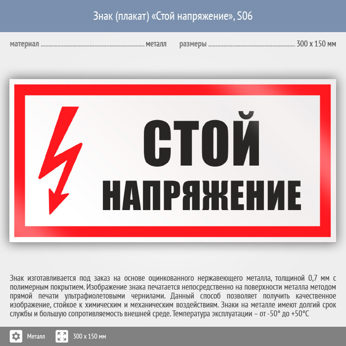 Знак (плакат) «Стой напряжение», S06 (металл, 300х150 мм) в Кызыле купить