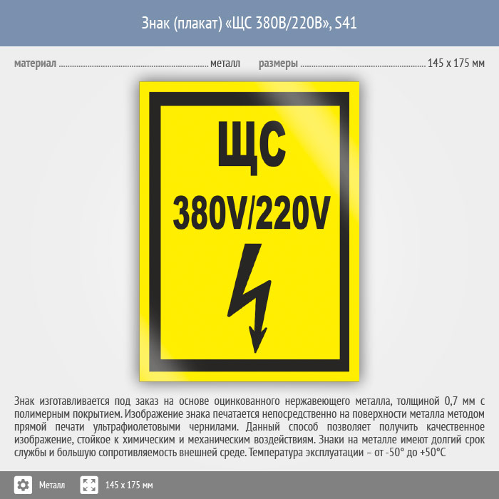 Знак (плакат) «ЩС 380В/220В», S41 (металл, 145х175 мм) в Кызыле купить