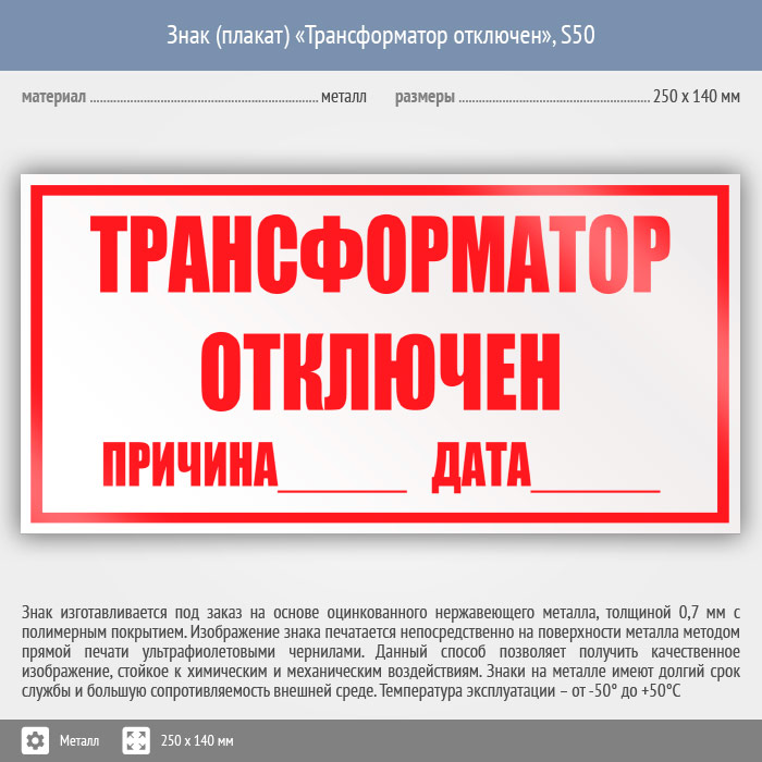 Знак (плакат) «Трансформатор отключен», S50 (металл, 250х140 мм) в Кызыле купить