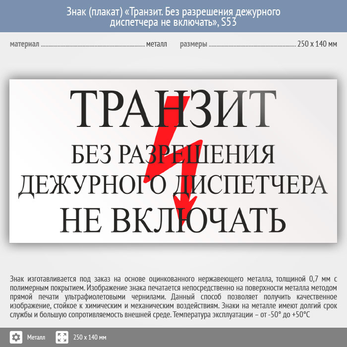 Знак (плакат) «Транзит. Без разрешения дежурного диспетчера Не включать», S53 (металл, 250х140 мм) в Кызыле купить