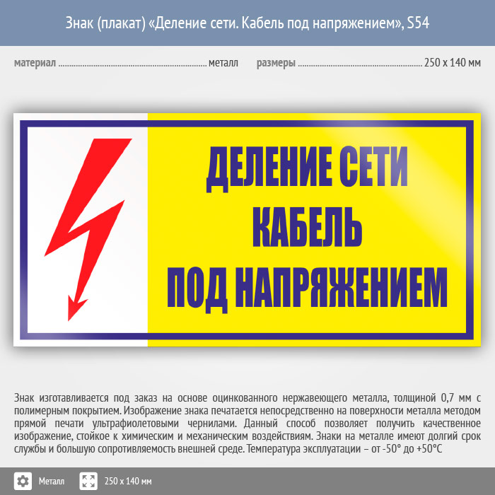 Знак (плакат) «Деление сети. Кабель под напряжением», S54 (металл, 250х140 мм) в Кызыле купить