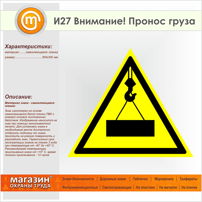 Знак «Внимание! Пронос груза», И27 (пленка, сторона 300 мм) в Кызыле купить