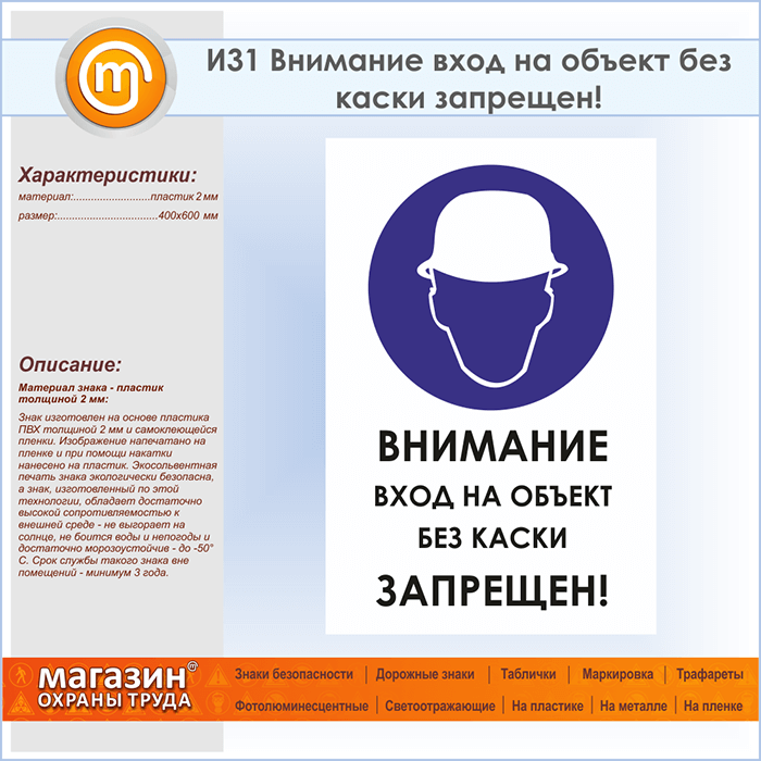 Знак «Внимание вход на объект без каски запрещен!», И31 (пластик, 400х600 мм) в Кызыле купить