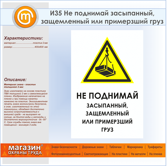 Знак «Не поднимай засыпанный, защемленный или примерзший груз», И35 (пластик, 400х600 мм) в Кызыле купить